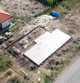 Заглублен на 1100 мм до несущего слоя грунта. Фундамент перекрыт монолитной железобетонной плитой — она выступает полом первого этажа. Одно из самых долговечных и надежных решений.