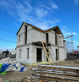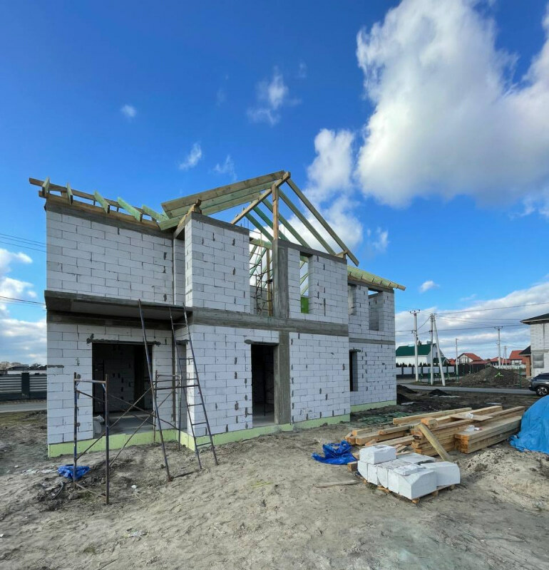 Стены из газобетона 300 мм, утепление, штукатурный фасад с деревянными планками, надежная кровля из битумной черепицы.